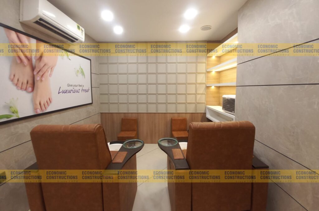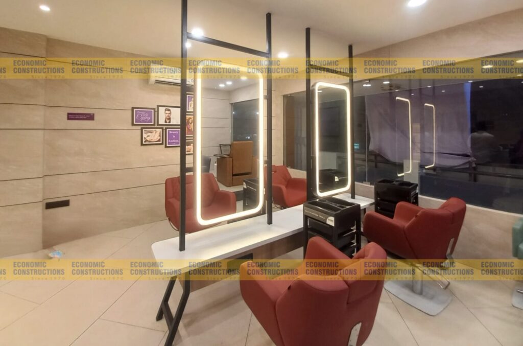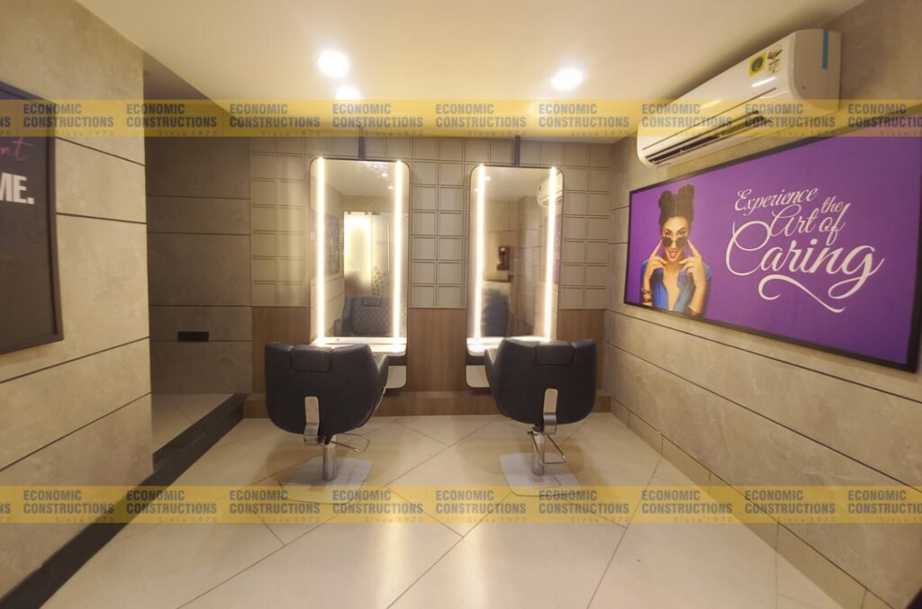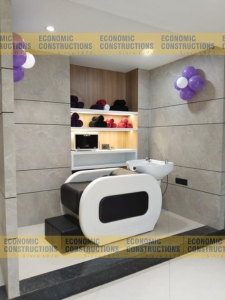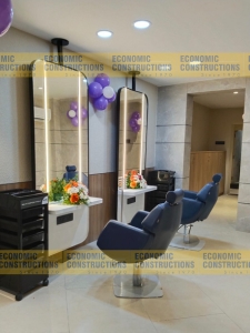 Details: Salon interior, Plumbing work, Tiles flooring, Electrical work, Glass work, Carpentry work, Painting, Storage box, Styling mirrors